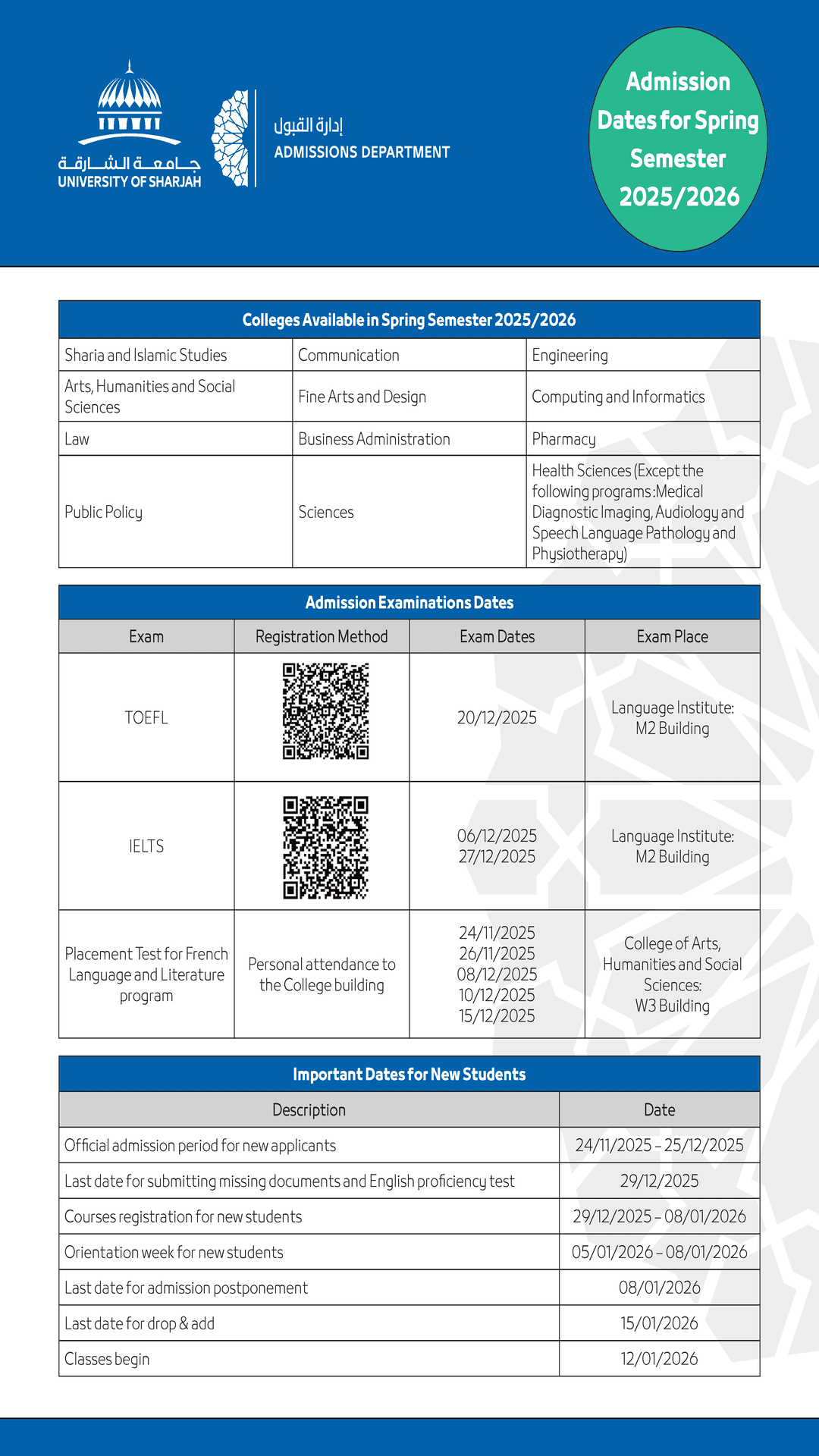 The University of Sharjah accepts students who are academically qualified and behaviorally distinguished, regardless of their nationality, color, religion, or disability.