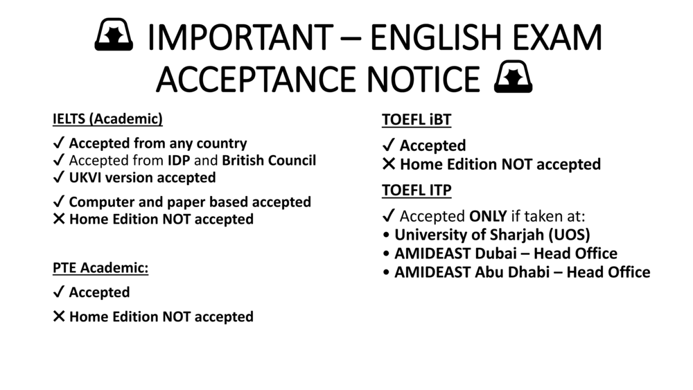 Upon admission to UoS and prior to course registration, all students admitted to UoS (new, transfer and bridging) must demonstrate a level of English proficiency consistent with the requirement of their college. Students can choose one of the alternative exams listed below for proof of proficiency.